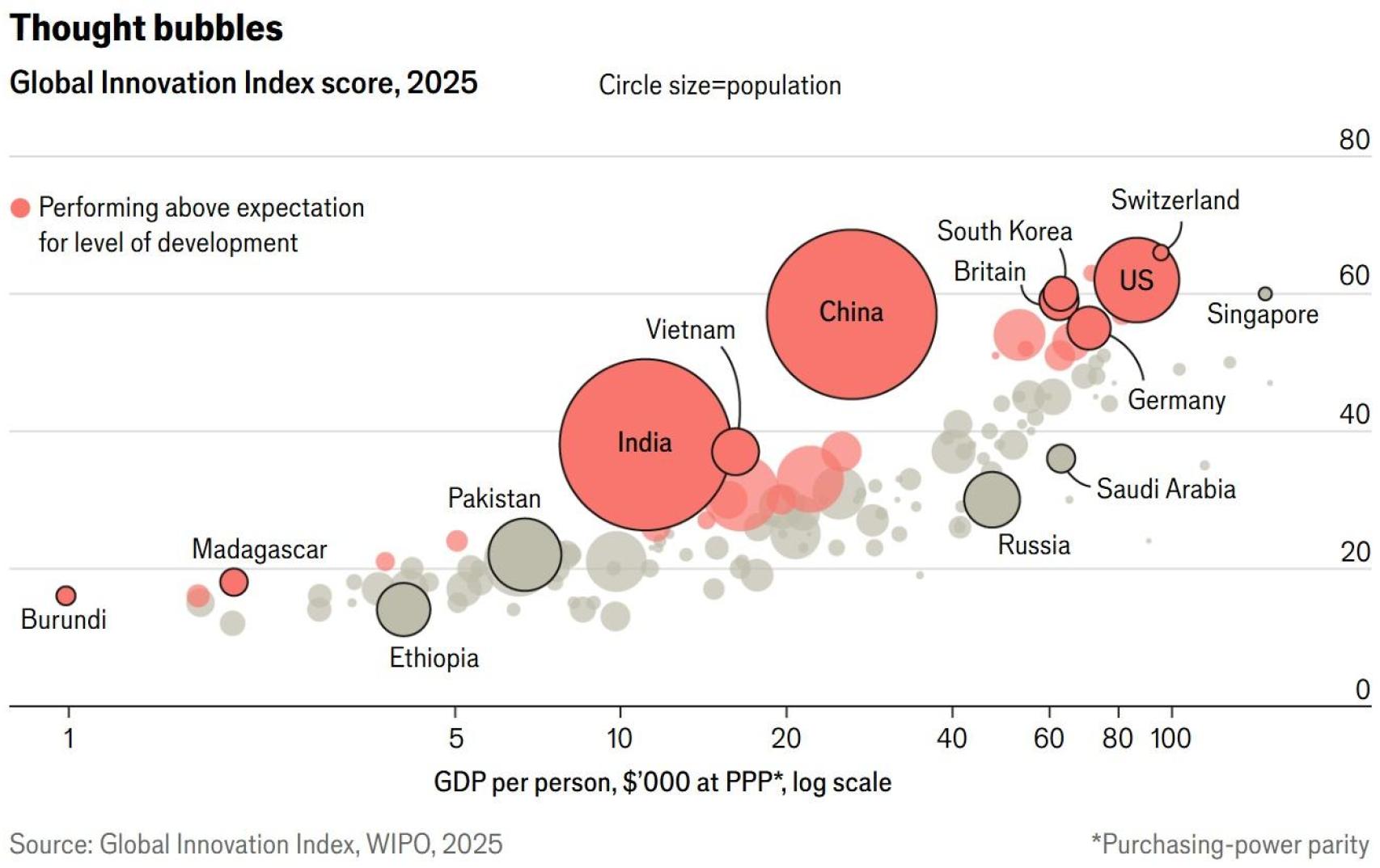 China’s entry into the top ten is all the more notable given its status as a middle-income economy. Countries with similar GDP per capita are expected to rank between 50th and 60th. Other countries that exceeded expectations for their income levels include India, South Korea, Vietnam and the United Kingdom.